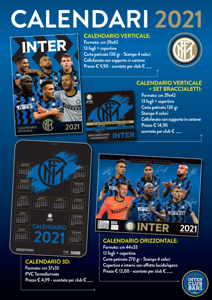 Buongiorno, come ogni anno potete acquistare (tramite il Club) i Calendari ufficiali dell’INTER ad un prezzo scontato. Il pagamento degli stessi dovrà avvenire contestualmente alla prenotazione tramite bonifico, lì dove non fosse possibile dovrete interpellare il Consigliere che ha effettuato la vostra iscrizione ed accordarvi su come fargli pervenire la cifra corrispondente entro e non oltre il 27 Novembre. Iban: IT14 T031 0404 0000 0000 0823 923